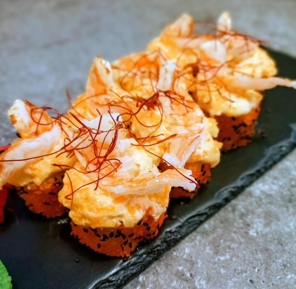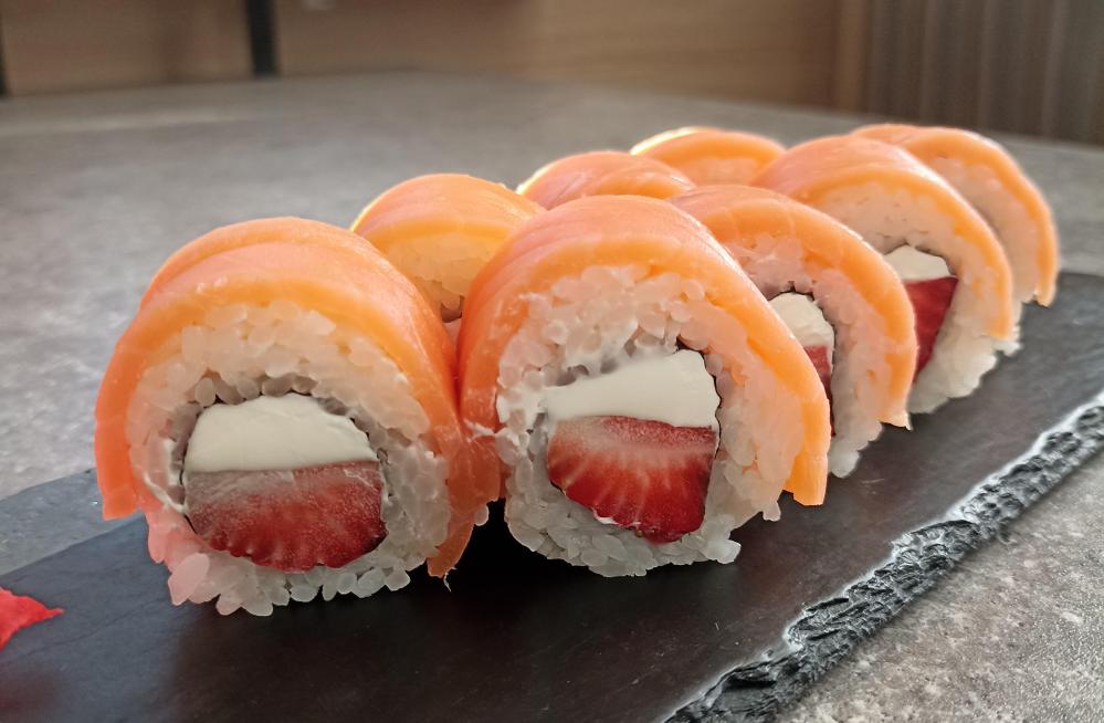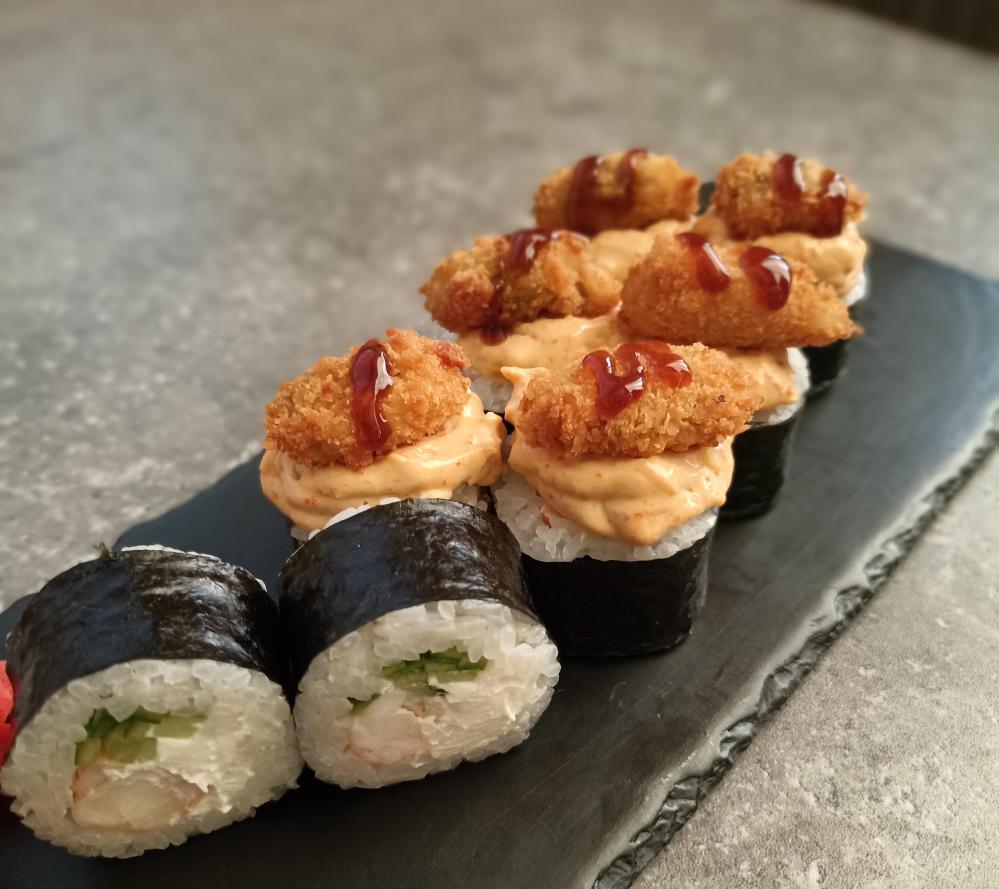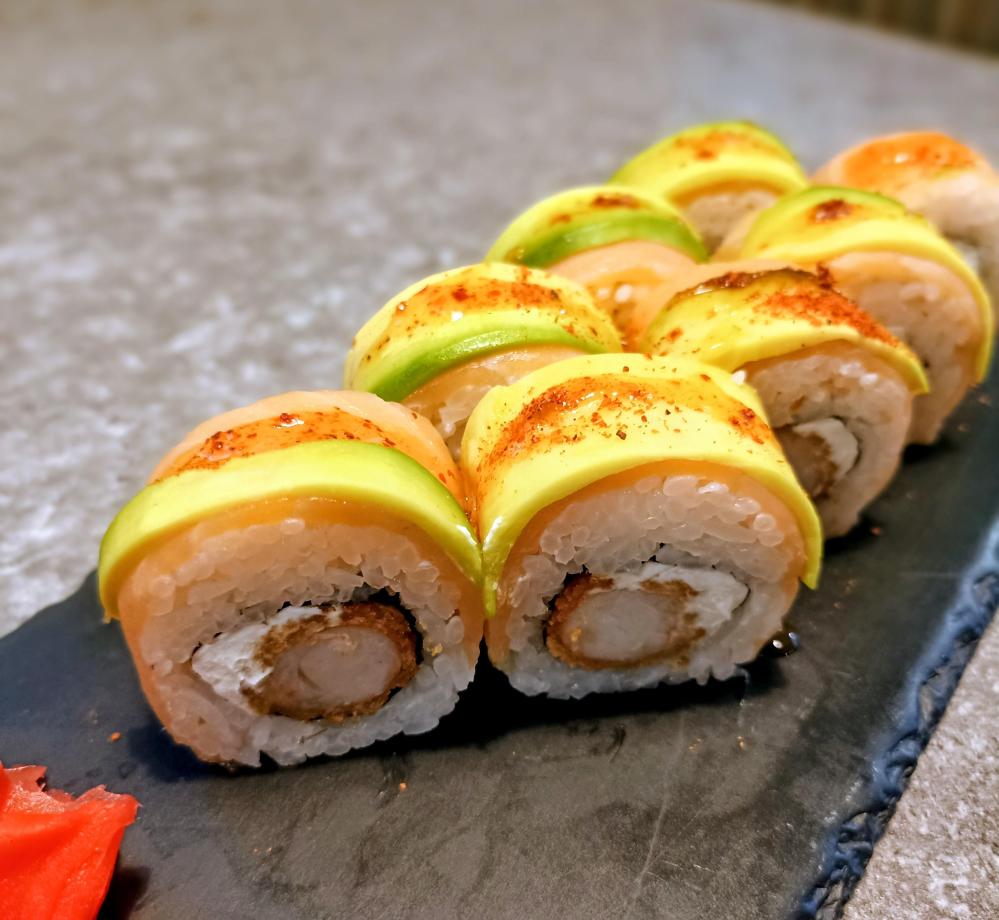 Лосось, авокадо, креветка темпура, сыр творожный, рис, нори, соус Чили сладкий, паприка