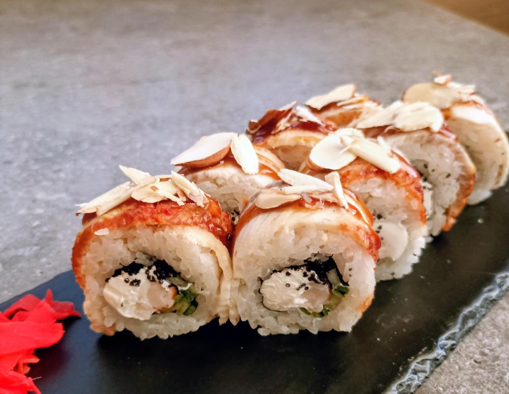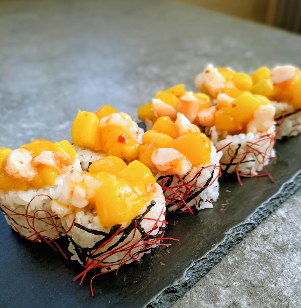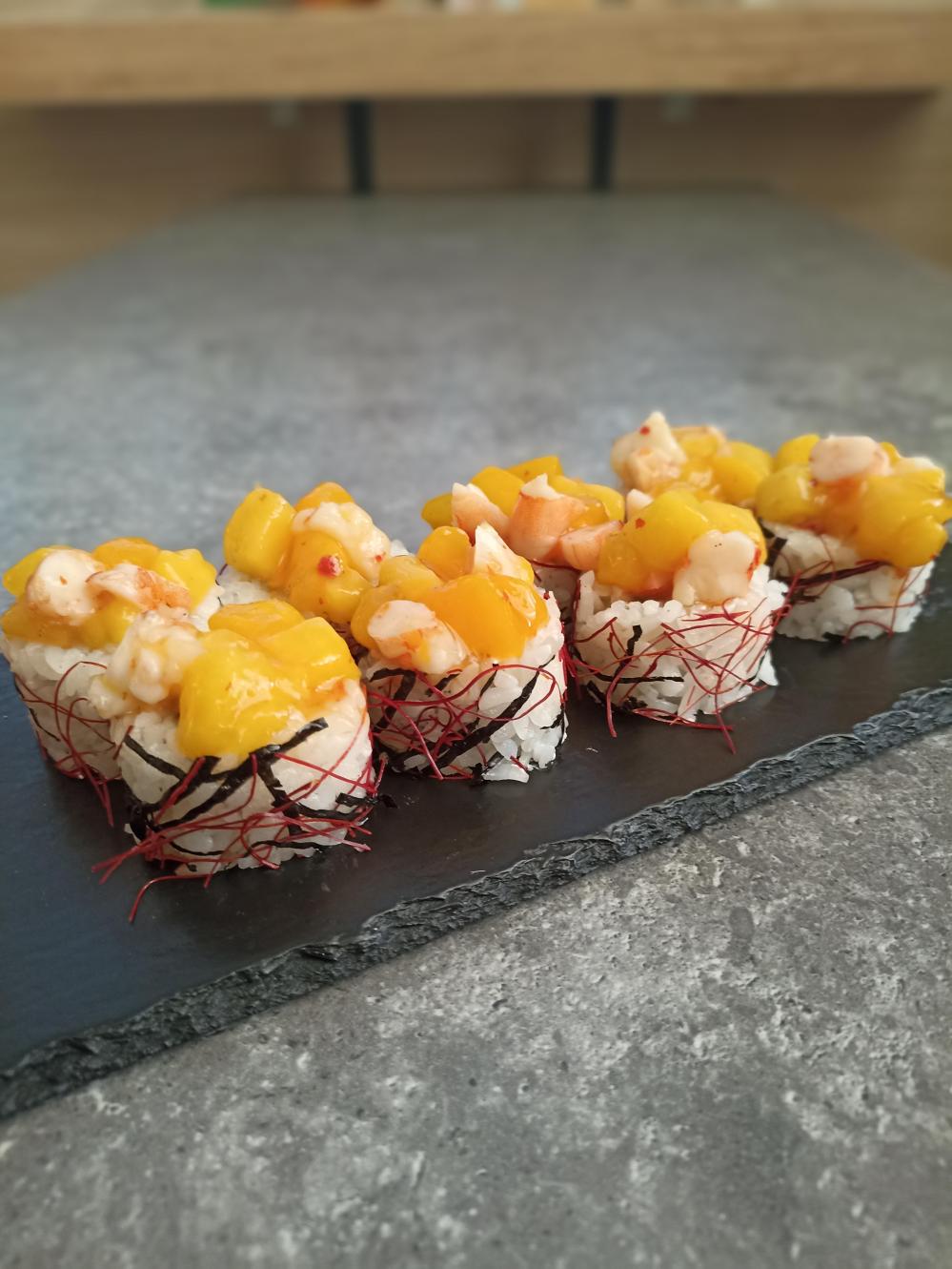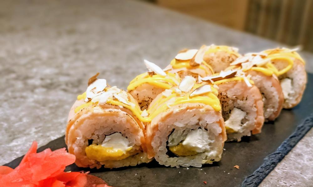 Лосось опаленный, манго , сыр творожный, соус манго ,миндальные лепестки, рис нори