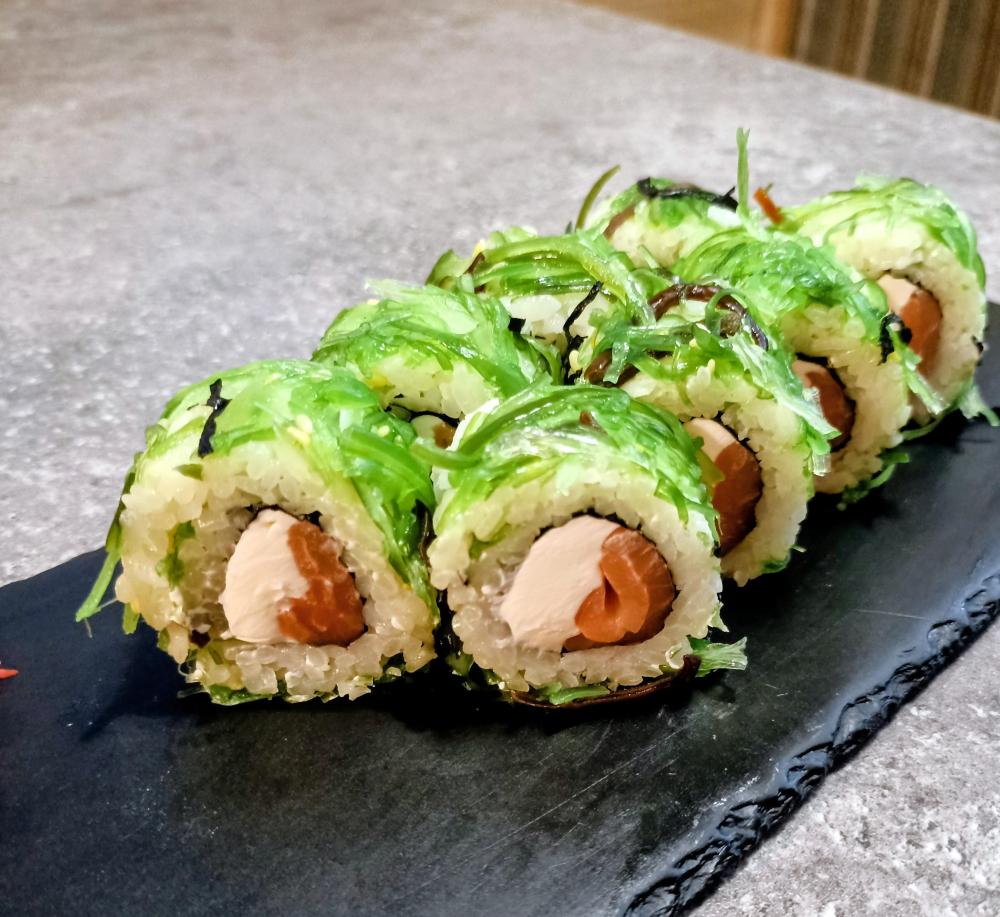 Рис, нори, лосось, сыр творожный, масаго оранжевая, огурец, лимон, укроп