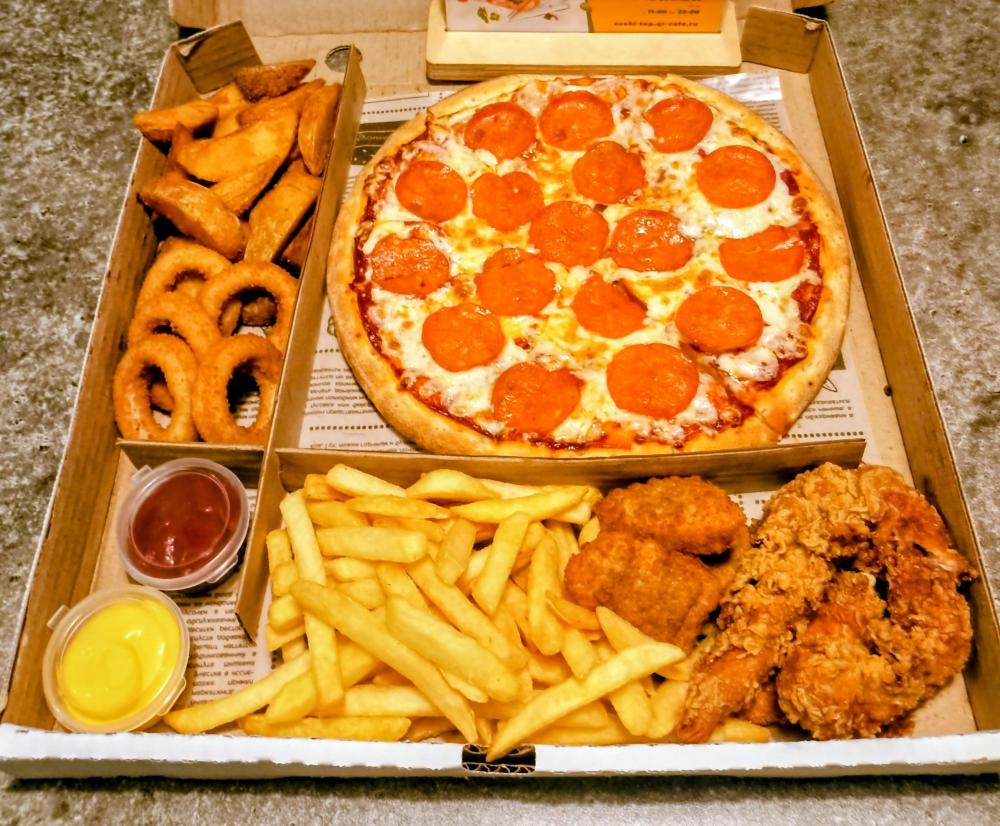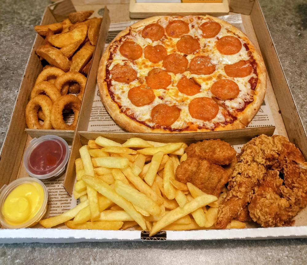 Пицца Пепперони (25 см), нагетссы 3 шт, стрипсы 3 шт, картофель фри , картофель по деревенски, луковые кольца 5 шт, соус сырный, соус томатный.