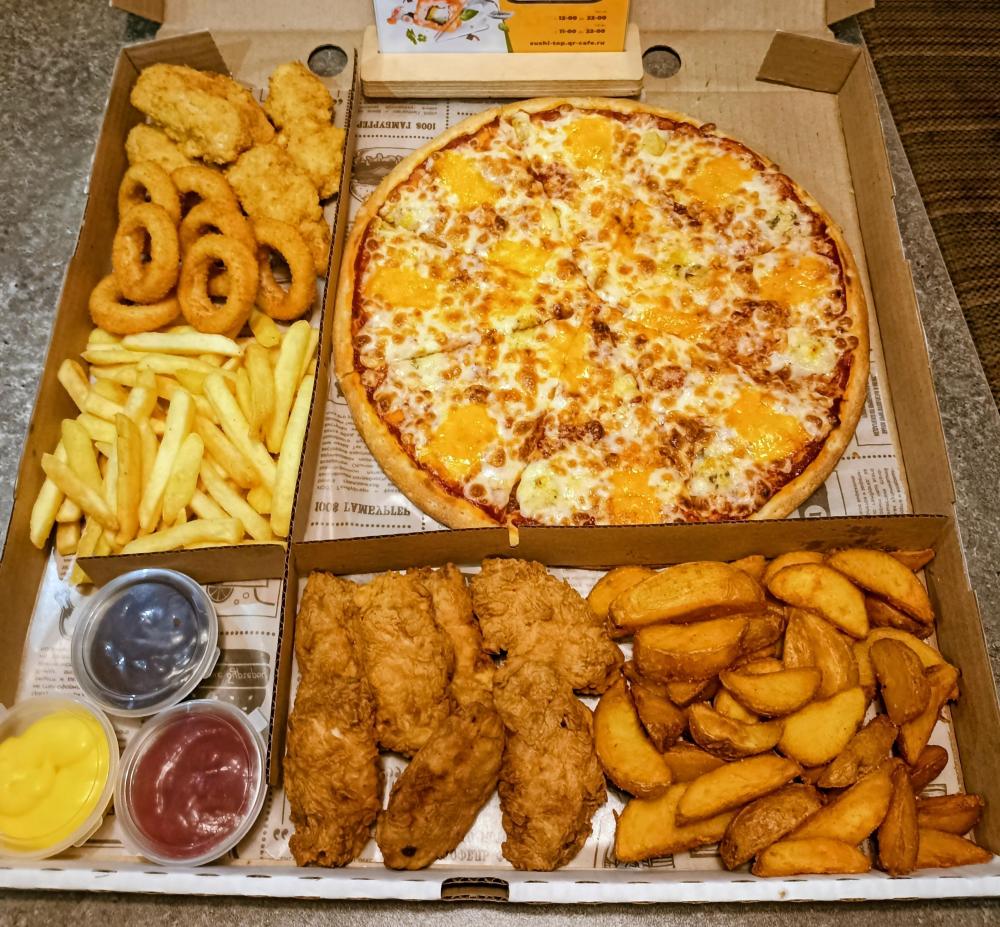 Пицца 4сыра( 30 см) , крылья 7 шт, луковые кольца 7 шт, сырные палочки 5 шт, картофель фри 2 шт, картофель по деревенски 2 шт, соус сырный, барбекю, томатный.