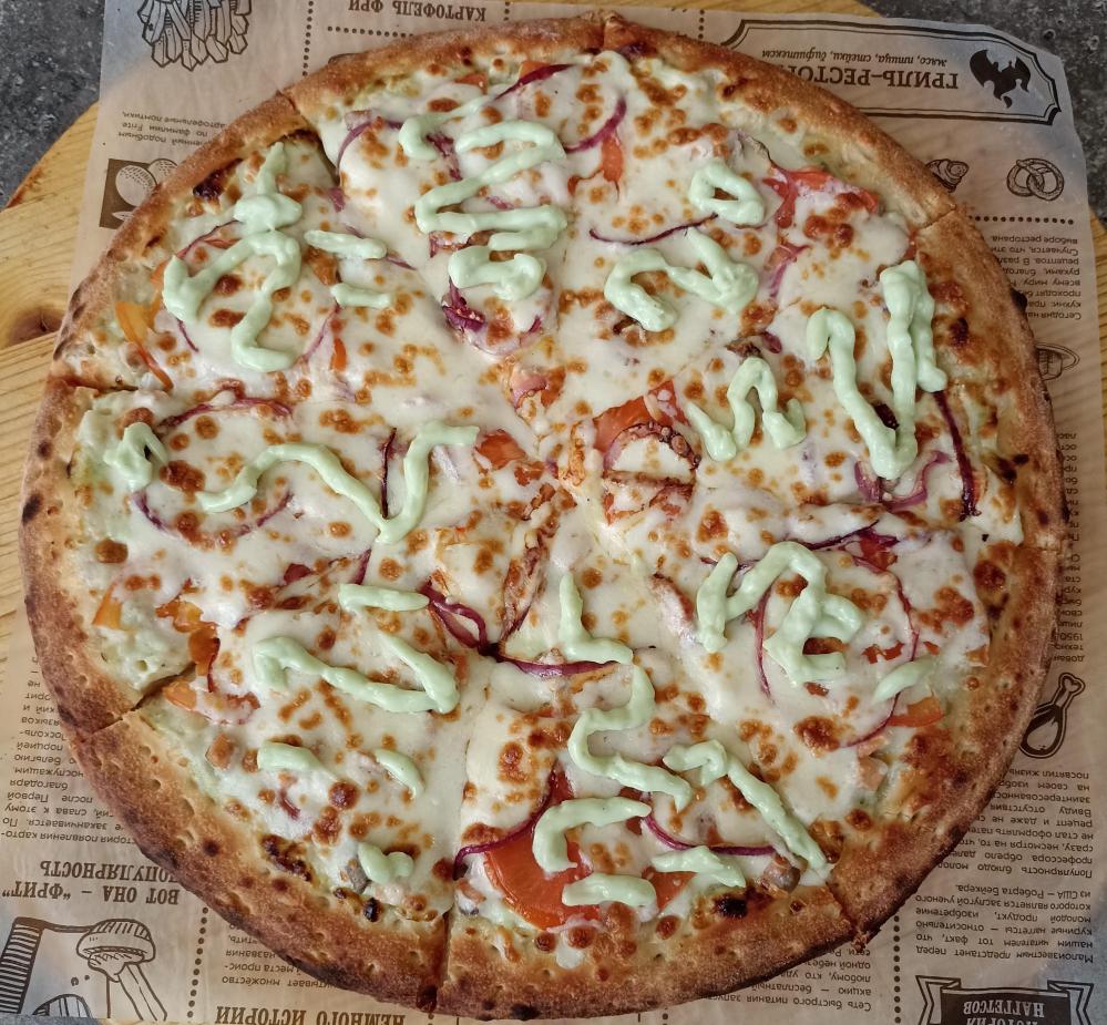 Соус васаби, лосось, помидор, оливки, лук, сыр моцарелла, тонкое тесто.